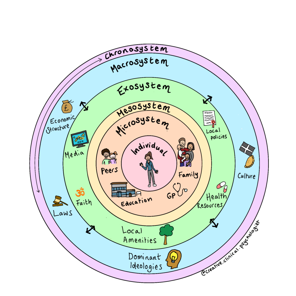 We recognise that children and young people are embedded within complex, interconnected systems and are affected by changes in these systems, as well as having the potential to effect positive change themselves within these systems. This includes within families, educational institutions, local communities and wider society.